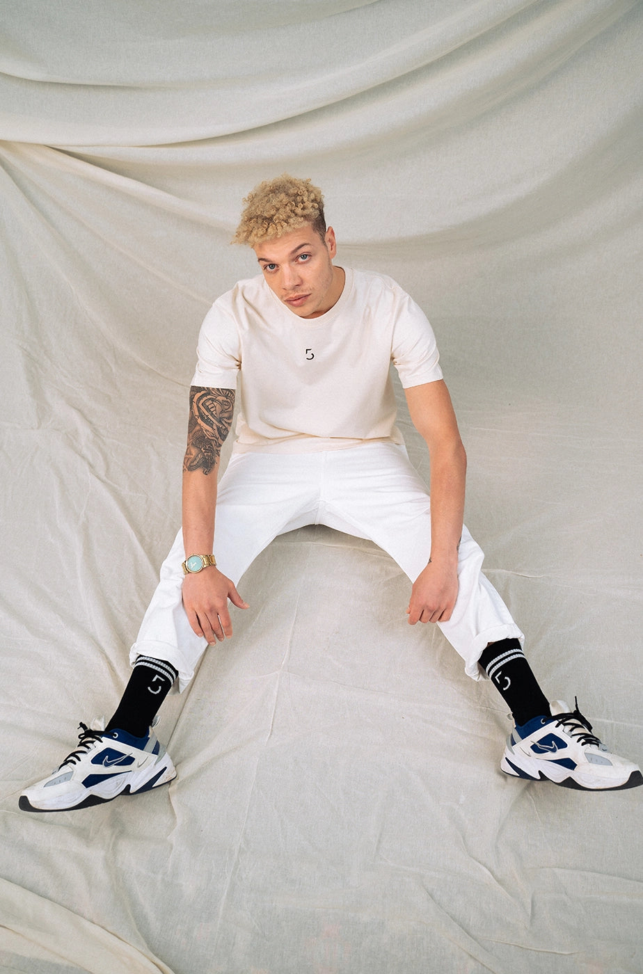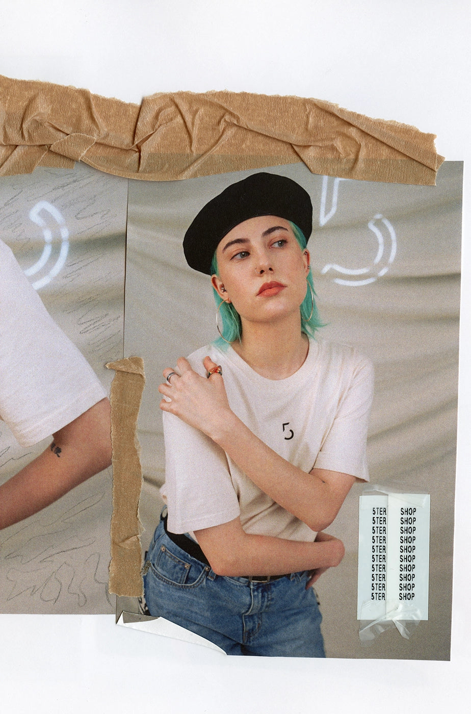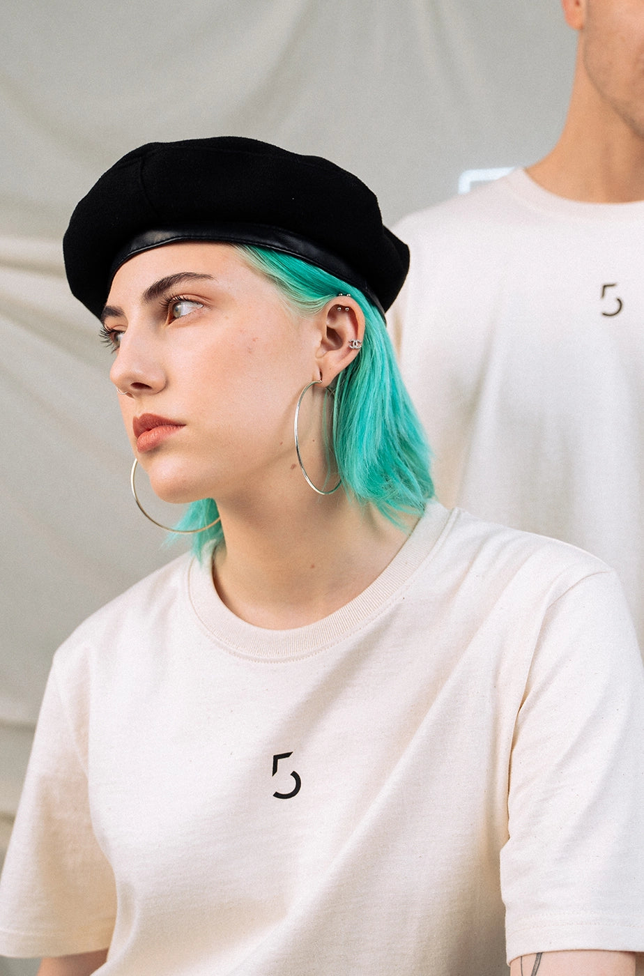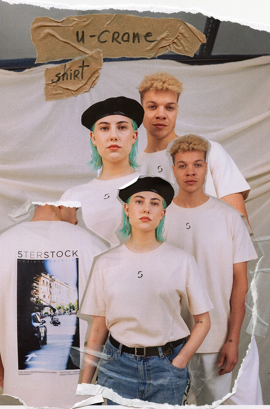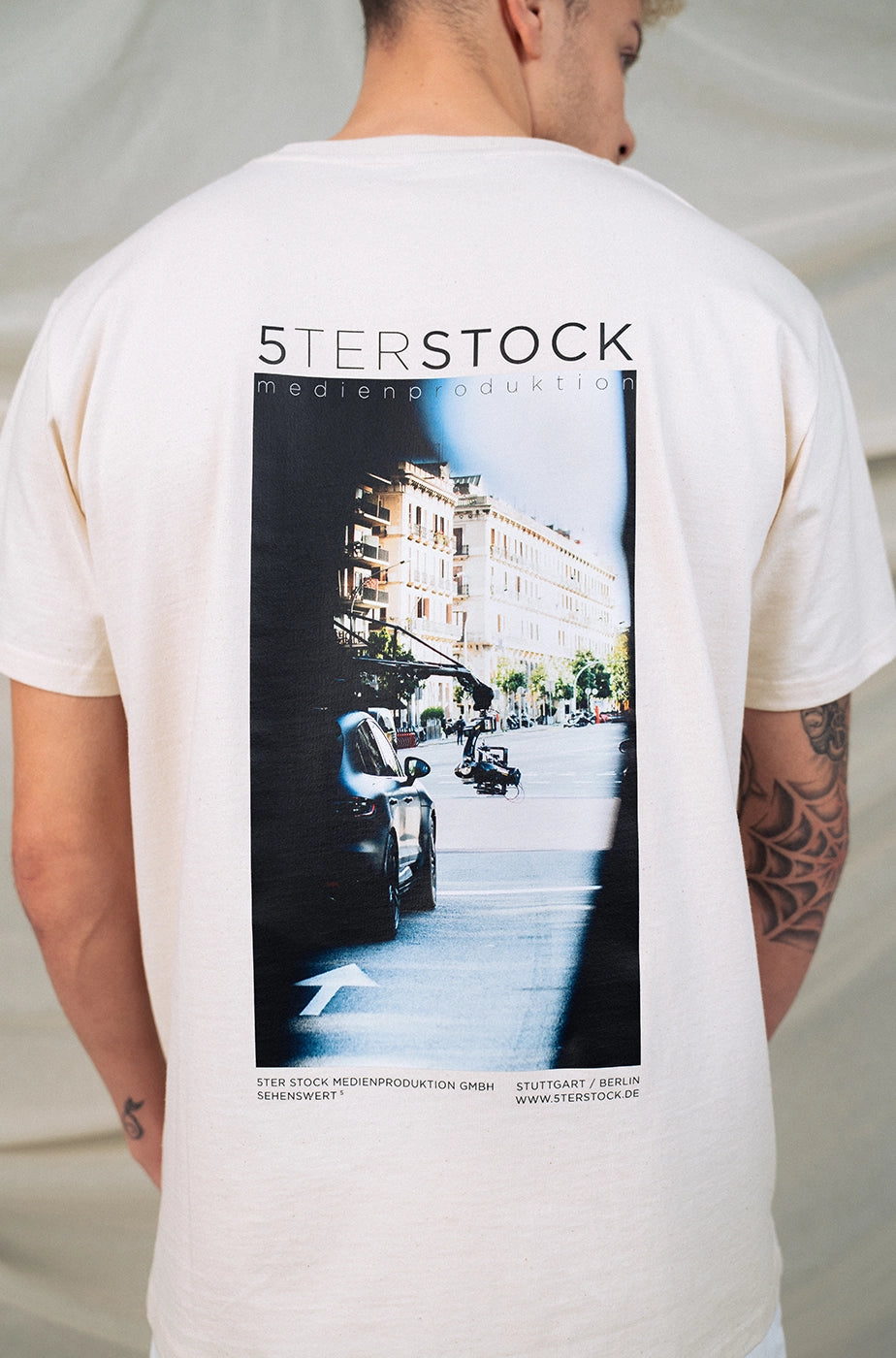 Massives T-Shirt in der Farbe "natural raw" mit Logo Siebdruck auf der Brust und großem Foto-Backprint. "U-CRANE" in Barcelona.